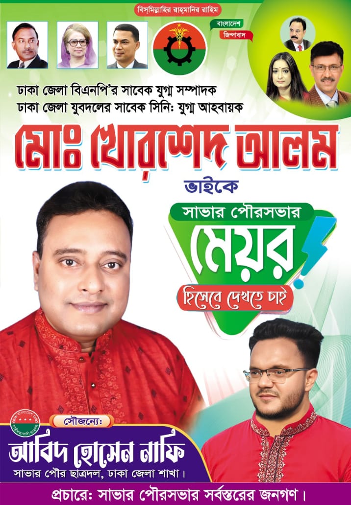 সাভার পৌর ছাত্রদলের নেতা আবিদ হোসেন নাফি বলেন, “আমাদের সাভার পৌরসভার সকল ওয়ার্ডের নেতাকর্মীরা,ব্যানার-ফেস্টুন টাঙ্গিয়ে নিজেদের অবস্থান জানান দিতে চান, মোঃখোরশেদ আলম ভাই কে মেয়র হিসেবে দেখতে চাই জয়যুক্ত করতে চাই।